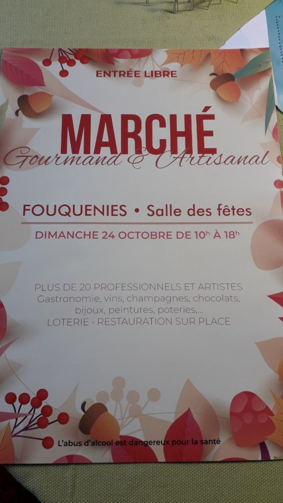 • Le dimanche 24 octobre 2021: marché gourmand et artisanal, salle des fêtes de Fouquenies (60), de 10h à 18h