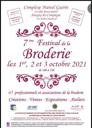 • Les vendredi, samedi et dimanche 01, 02 et 03 octobre 2021 : 7ème festival de la broderie, Complexe Marcel Guérin 124 allée Marcel Guérin Margny les Compiègne (60), de 10h à 18h.