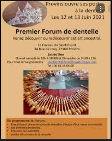 • Les samedi et dimanche 12 et 13 juin 2021 : forum de la dentelle, caveau du Saint Esprit, 34 rue de Jouy à Provins (77) de 10h à 18h et de 9h30h à 17h.